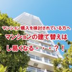 2022年2月15日 / 最終更新日時 : 2022年2月15日 kogashi-fudousan 不動産豆知識 【不動産の豆知識】マンション購入を検討されている方へ マンションの建て替えはし易くなる・・・?! 現在、マンション購入を検討されている方はご確認下さい。現在、政府は分譲マンションの建て替え条件を緩和する検討に入っています。所有者の賛同割合の引き下げなどを柱に区分所有法の改正を目指しています。建て替えやすくして老朽化マ […]